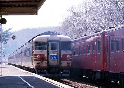 後追いですが、キハ183系の特急『北斗』です。場所は上の写真と同じ大沼公園駅。 先頭車改造された車両で、いまでも単編成をくむときに便利なためか、臨時列車や団体列車に充当されていることが多いようです。 全面展望はまったくなく、悲しい限りではあります。 この車両の塗り分け、これが一番好きだなぁ。いまのはどうも、しまりがないような気がして......。 |