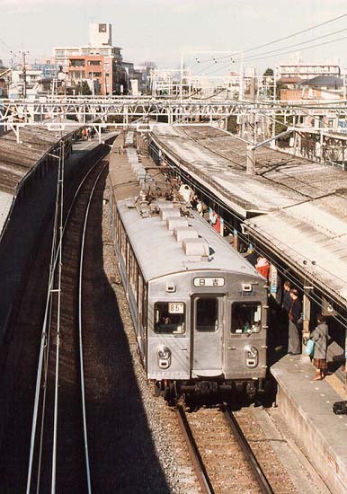 地上時代の田園調布駅です。東横線の横浜方面は3番線。渋谷方面は4番線でした。高級住宅地の出口(保存予定の駅舎)より、目蒲線の方が駅長室だったのでしょ。この写真を見て初めて発見してしまいました。 写真は駅構内の跨線橋から撮影しました。とても狭い跨線橋で、列車が駅に到着すると、撮影のために立っているとじゃまになるくらい。乗客の少ないときにシャッターを切った思い出があります。 7000系は全車両がモーター車。2両で1ユニットでした。先頭車と次の車両の屋根の色が、だいぶ違うのに気づかれると思います。検査はユニット単位で行うものなのだと思いますが、先頭車は先頭車同士、だったのでしょうか。 全面の窓ガラスのHゴムは黒になっています。撮影時期は調査中なのですが、だいぶ後期のものなのでしょう。 |